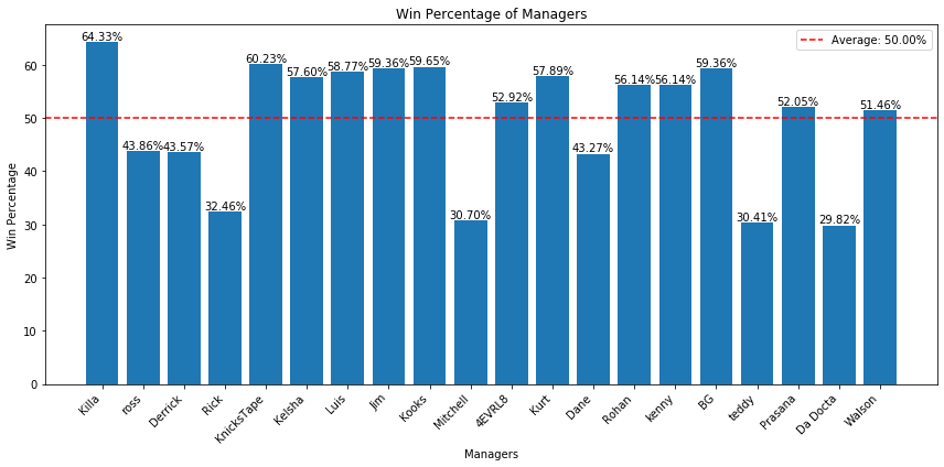 As seen in the win percentage plot above, seven teams either decided to tank or had bad fortunes, resulting in win percentages well below the league average. The other thirteen teams fiercely competed for the final eight playoff spots. Congratulations to the two conference winners, Killa (Sub Zero) and Knickstape (Spike Lee’s), for taking home first and second place respectively and being the only teams with a matchup win rate higher than 60%. One has to wonder if the many upsets we saw throughout the playoffs were significantly influenced by rest.