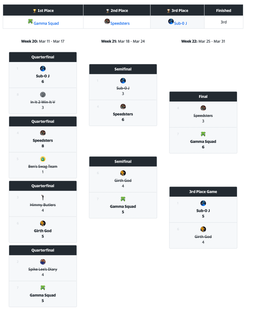 The inaugural fantasy season has been a grind. After 19 regular weeks, 8 teams competed for the championship. Overlooked and considered unfavorable, Gamma Squad rose to a new level, upsetting every team in their way. In the first round, they defeated the #2 seed, Spike Lee’s Diary, with a score of 5-4, and then beat the 6th seed, Girth God, in a similar fashion in the semifinals. In the finals, the only obstacle remaining was Speedsters, whom they defeated handily, emerging victorious with a 6-3 score. Congratulations to the inaugural champion, Gamma Squad!
