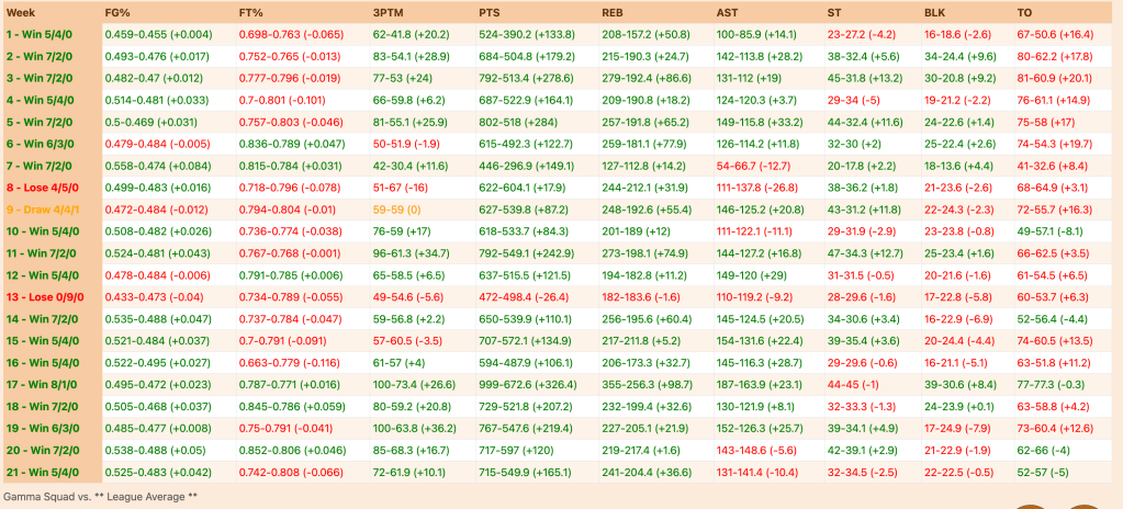 Gamma Squad consistently performed well across various statistics compared to the league average, securing victories in the majority of the weeks and demonstrating strong performance in scoring, rebounding, and assists.