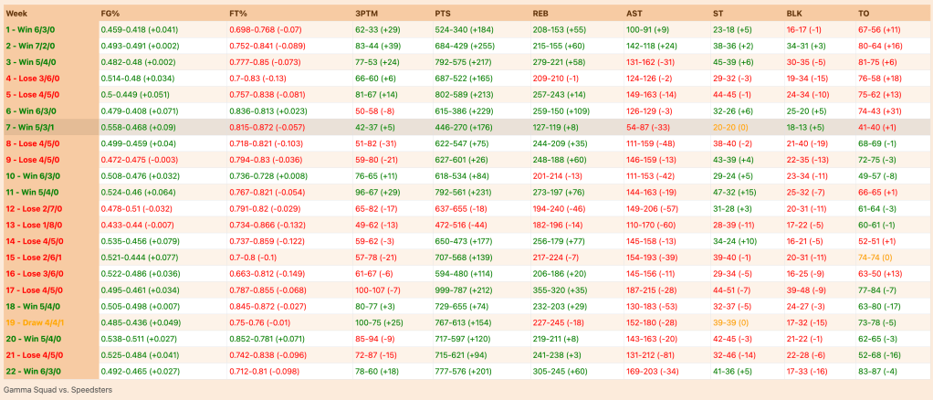 - Free Throw Percentage (FT%): The FT% for Gamma Squad fluctuated more widely than Speedsters, with some weeks above and others below the league average. Speedsters generally had a more consistent FT%.